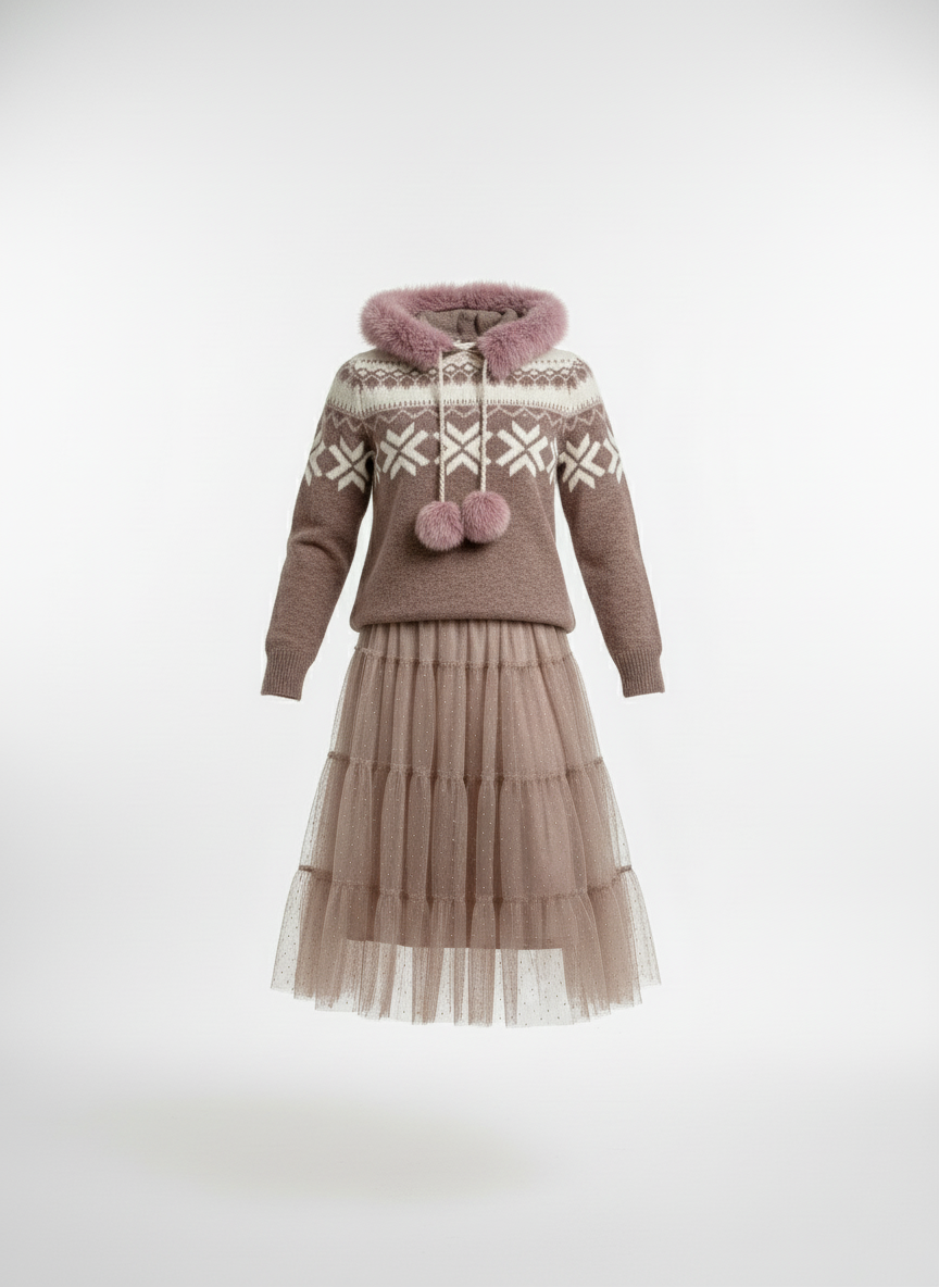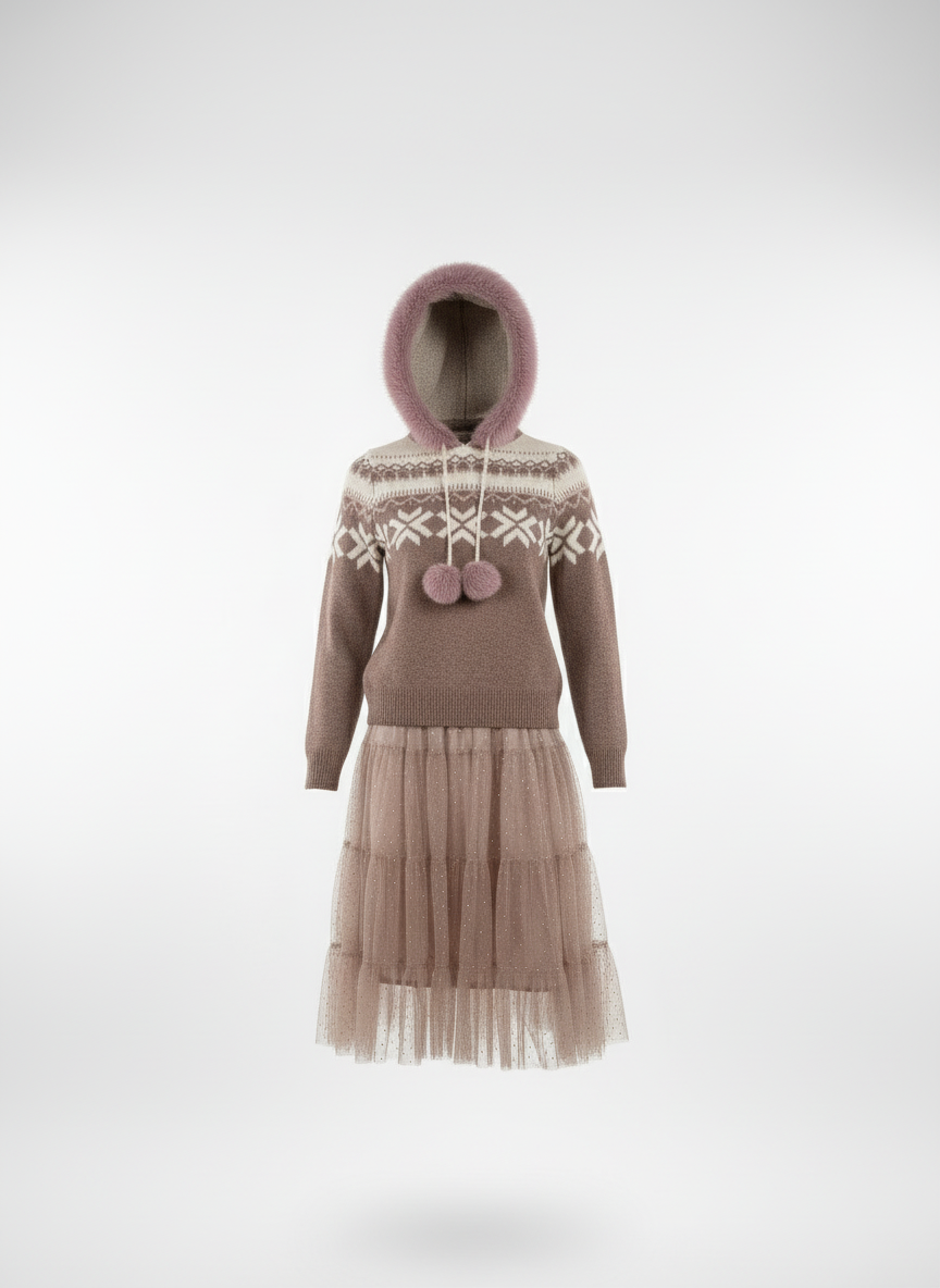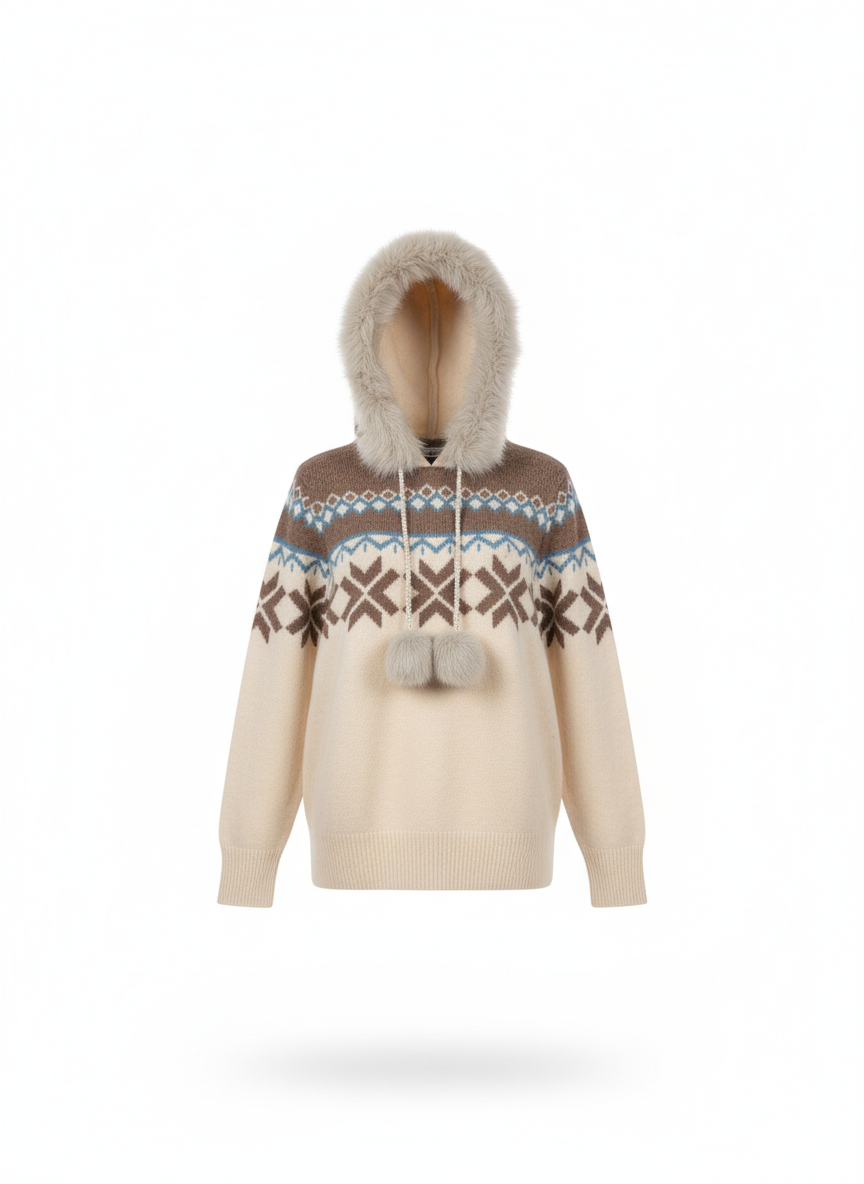 "Der Kapuzenpulli Agneta überzeugt mit weichem Webpelz und einem abnehmbaren Pommel-Perlenband – ein eleganter Hoodie mit besonderem Detail."