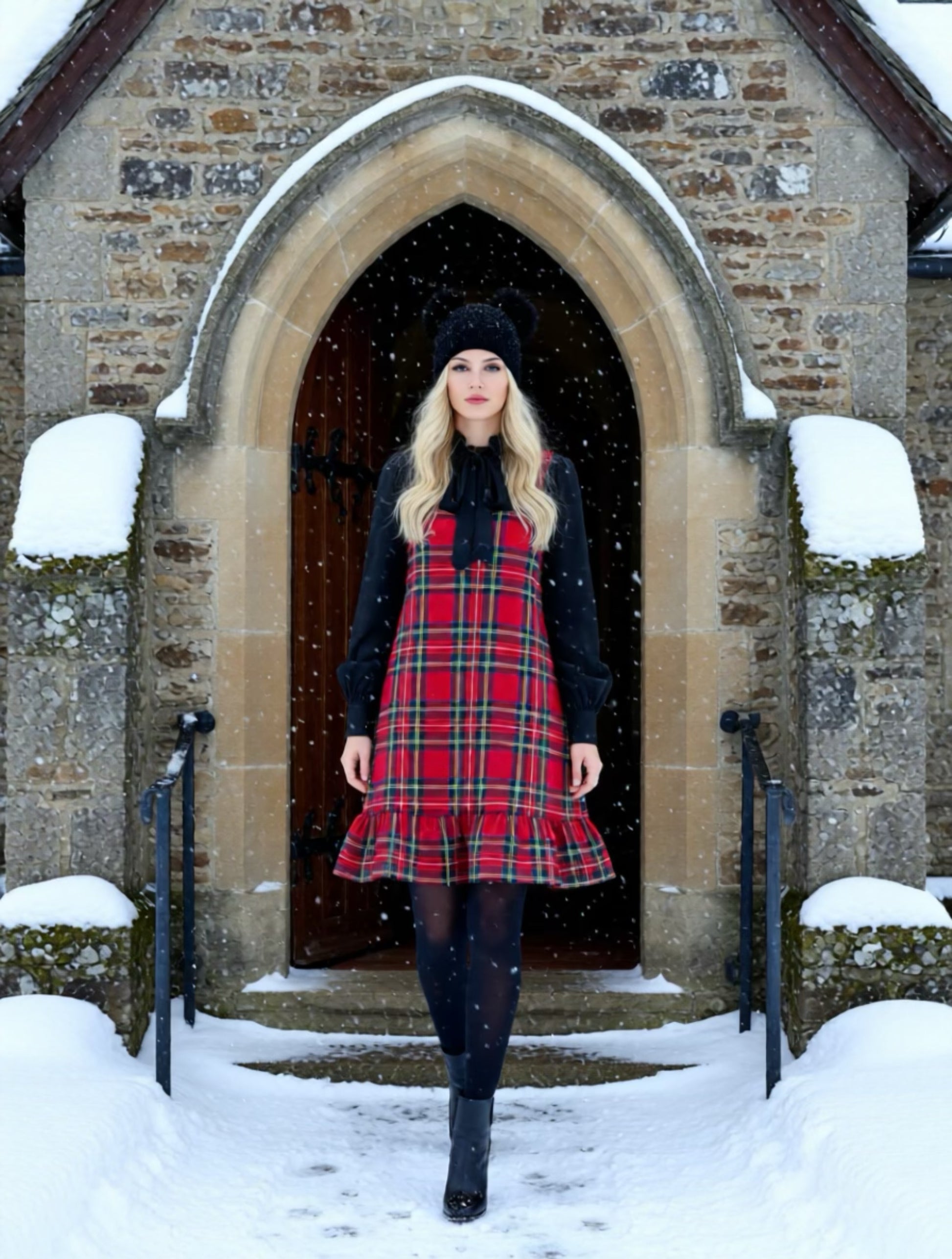 Stylishes Tartan-Kleid mit verspieltem Volant – ein femininer Look mit zeitlosem Karomuster.