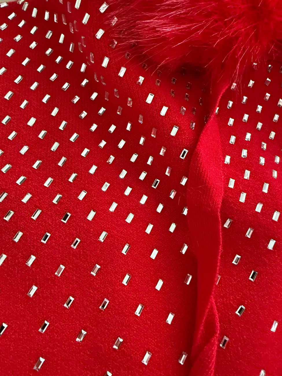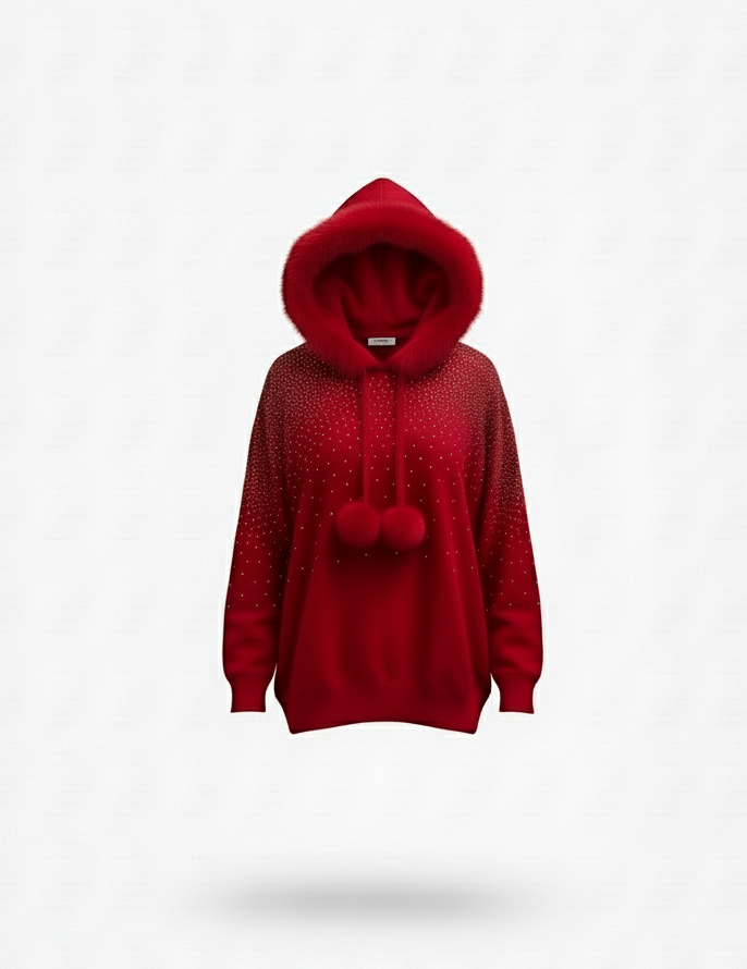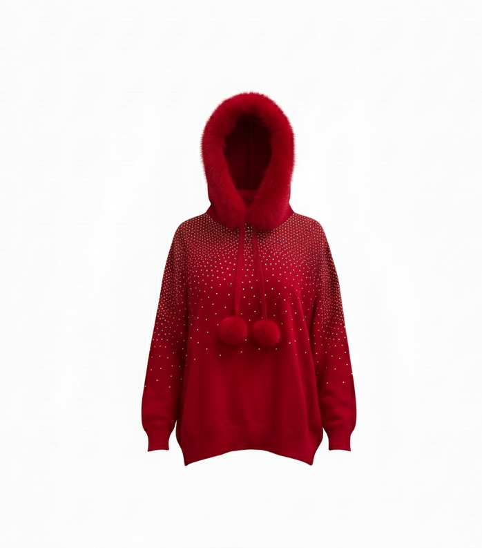 "Der Pullover Noel begeistert mit funkelndem Glitzer und einer abnehmbaren Webpelz-Kapuze – ein kuscheliger Hingucker für die kalte Saison."