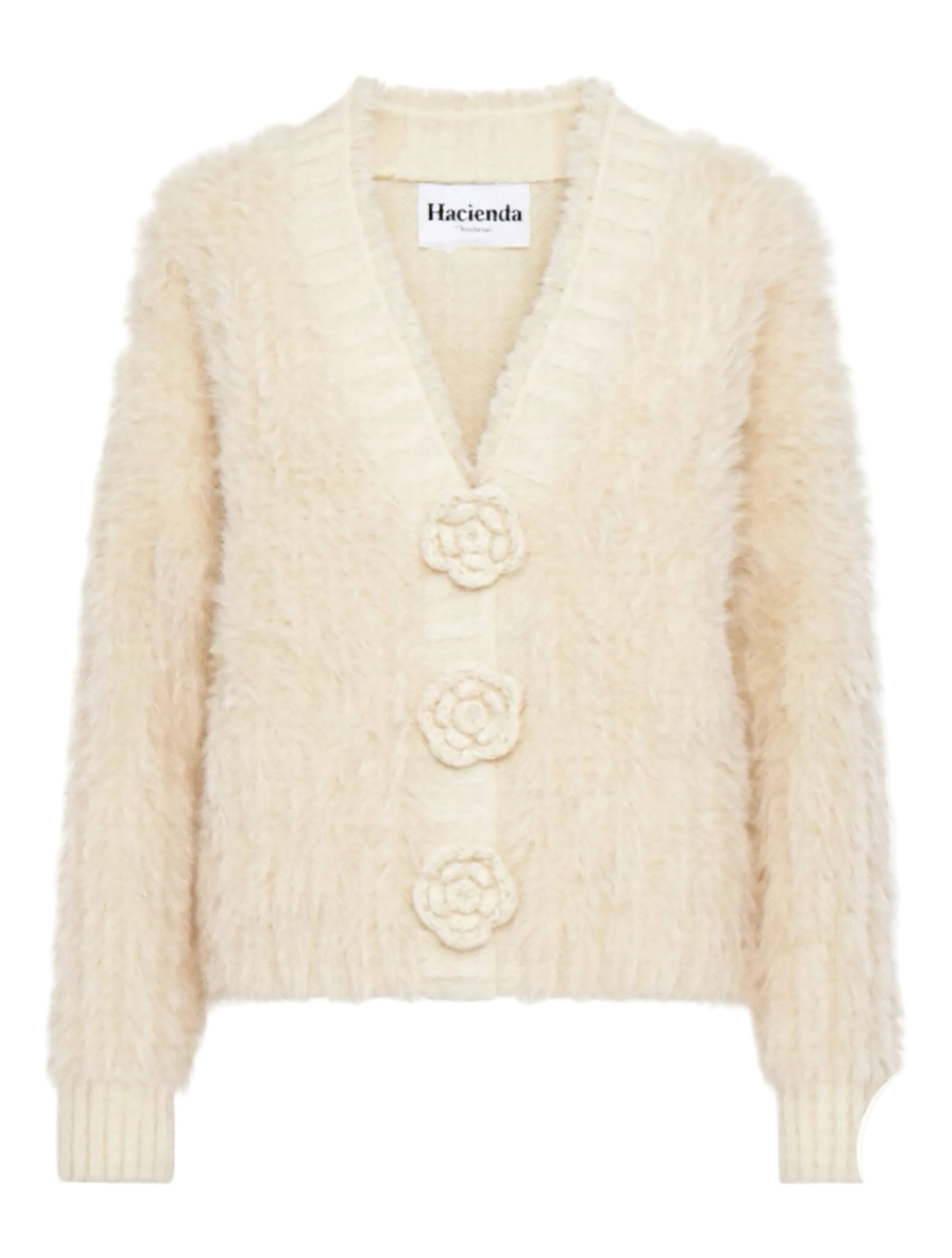 Kuschelige Strickjacke aus weichem Garn, vielseitig als Pulli tragbar, verziert mit gestrickten Rosenknöpfen