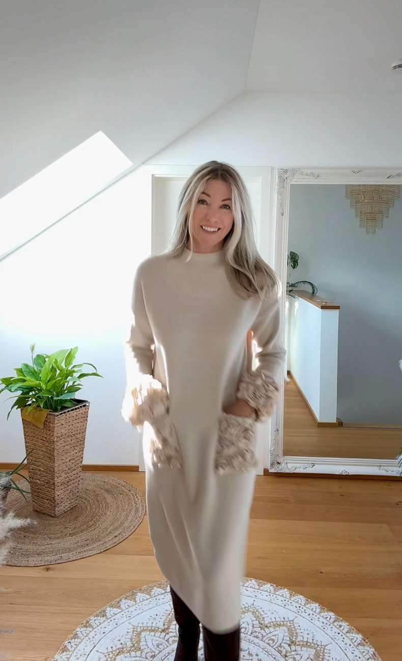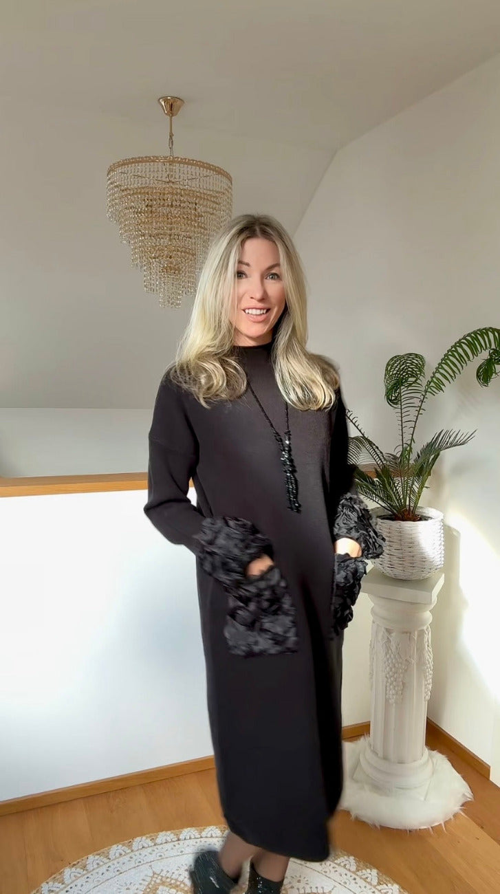 "Ein Kleid mit Wow-Effekt – das Strickkleid mit 3D-Rosen als Taschen vereint Eleganz, Komfort und außergewöhnliches Design."